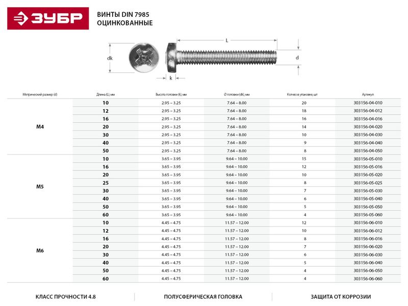 Купить Винт DIN 7985 M4x20мм, 14шт, кл. пр. 4.8, оцинкованный, ЗУБР