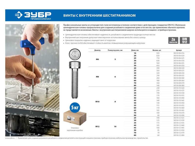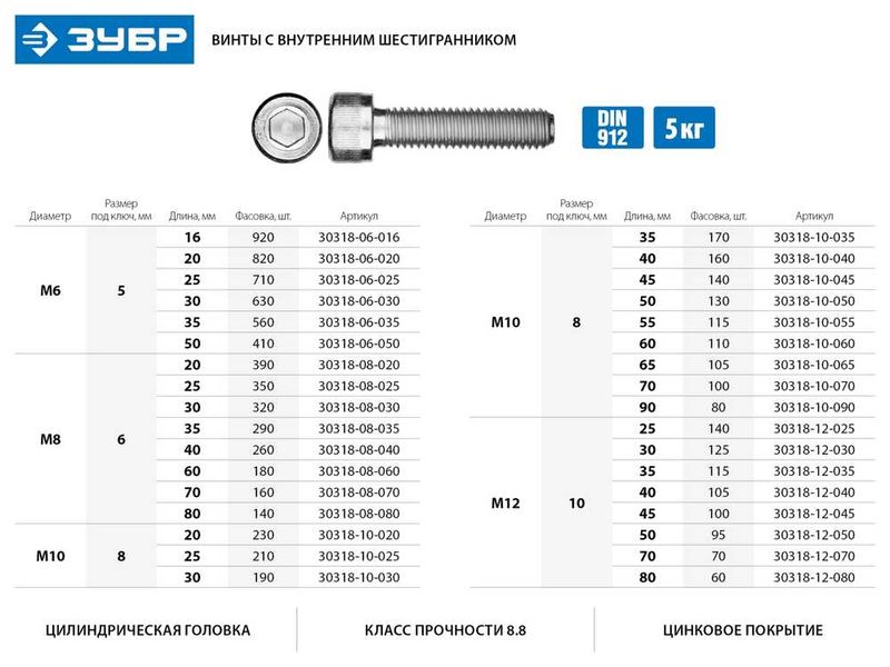 Купить Винт DIN 912, М6x16 мм, 5 кг (920 шт.), кл. пр. 8.8, оцинкованный, ЗУБР