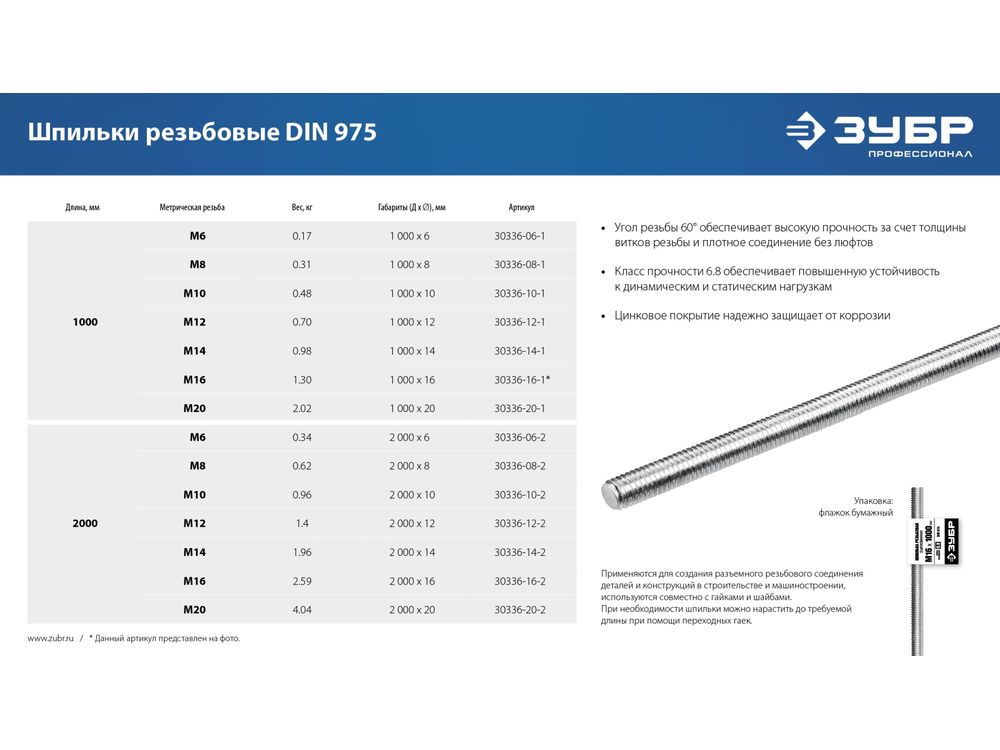 ЗУБР DIN 975, кл. пр. 6.8, М16 x 1000 мм, резьбовая шпилька, 1 шт, Профессионал (30336-16-1)
