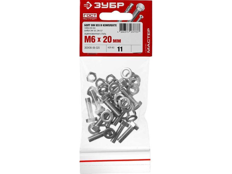 Купить Болт (DIN933) в комплекте с гайкой (DIN934), шайбой (DIN125), шайбой пруж. (DIN127), M6 x 20 мм, 11 шт, ЗУБР