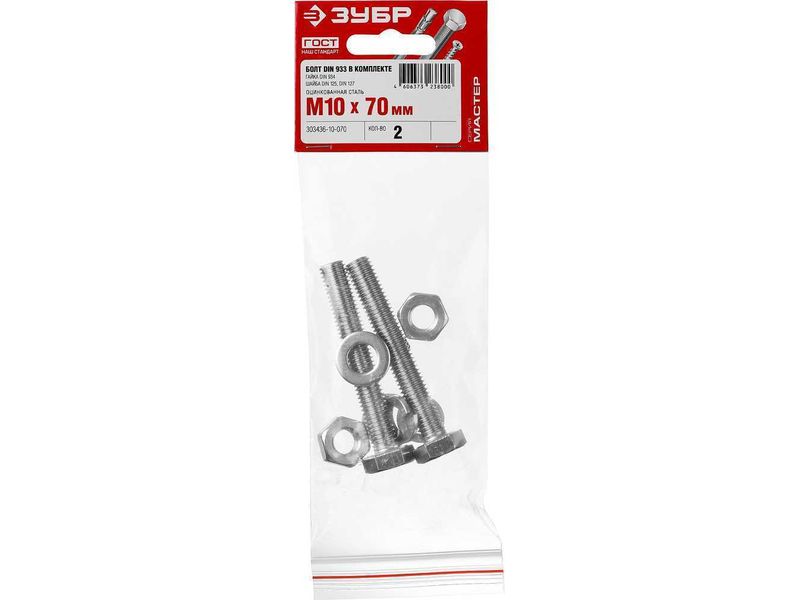Болт (DIN933) в комплекте с гайкой (DIN934), шайбой (DIN125), шайбой пруж. (DIN127), M10 x 70 мм, 2 шт, ЗУБР