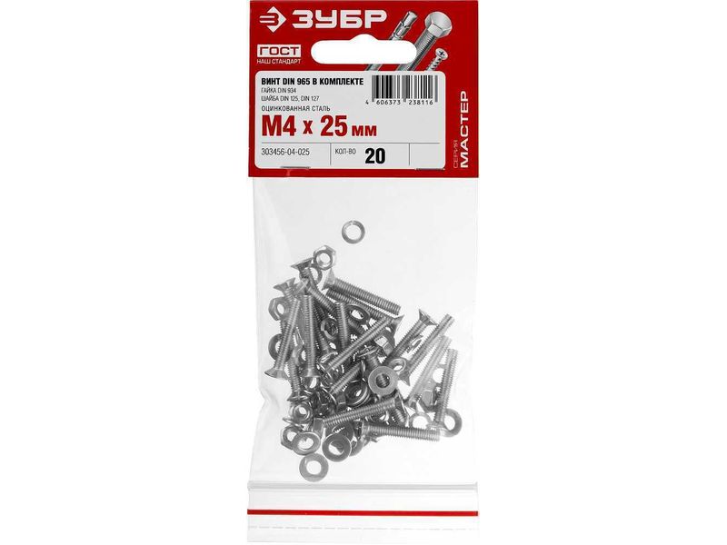 Винт (DIN965) в комплекте с гайкой (DIN934), шайбой (DIN125), шайбой пруж. (DIN127), M4 x 25 мм, 20 шт, ЗУБР |