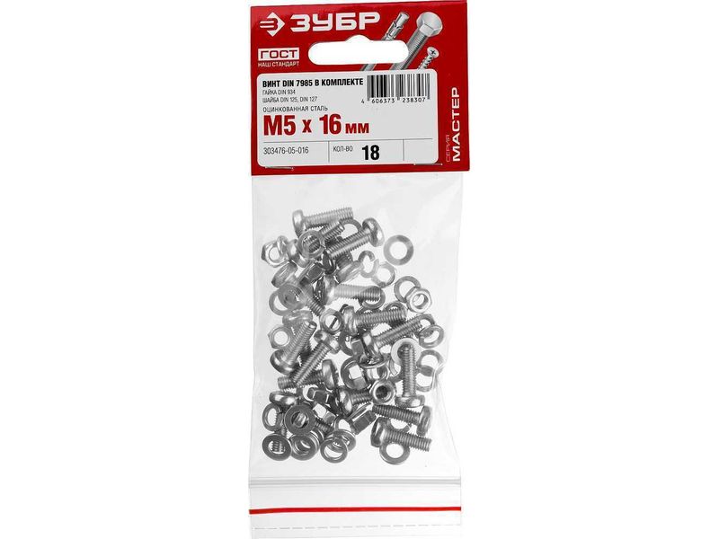 Винт (DIN7985) в комплекте с гайкой (DIN934), шайбой (DIN125), шайбой пруж. (DIN127), M5 x 16 мм, 18 шт, ЗУБР |