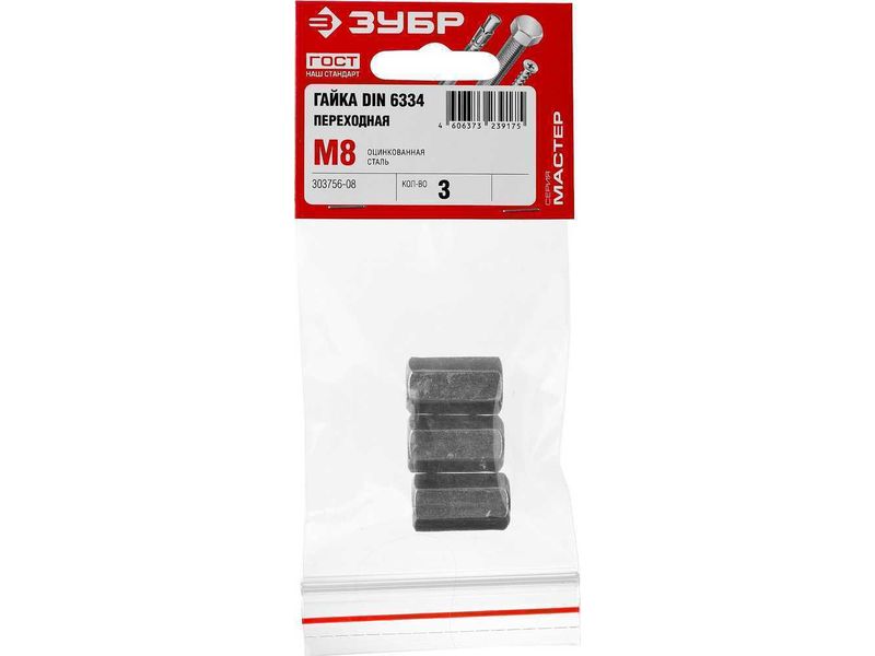 Гайка DIN 6334 переходная, M8, 3 шт, оцинкованная, ЗУБР