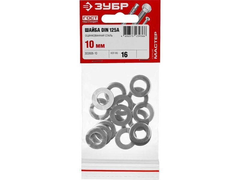 Шайба DIN 125A, 10 мм, 16 шт, оцинкованная, ЗУБР-609