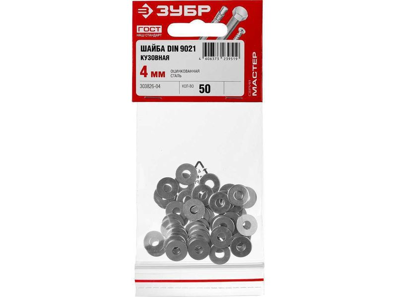 Шайба DIN 9021 кузовная, 4 мм, 50 шт, оцинкованная, ЗУБР-610