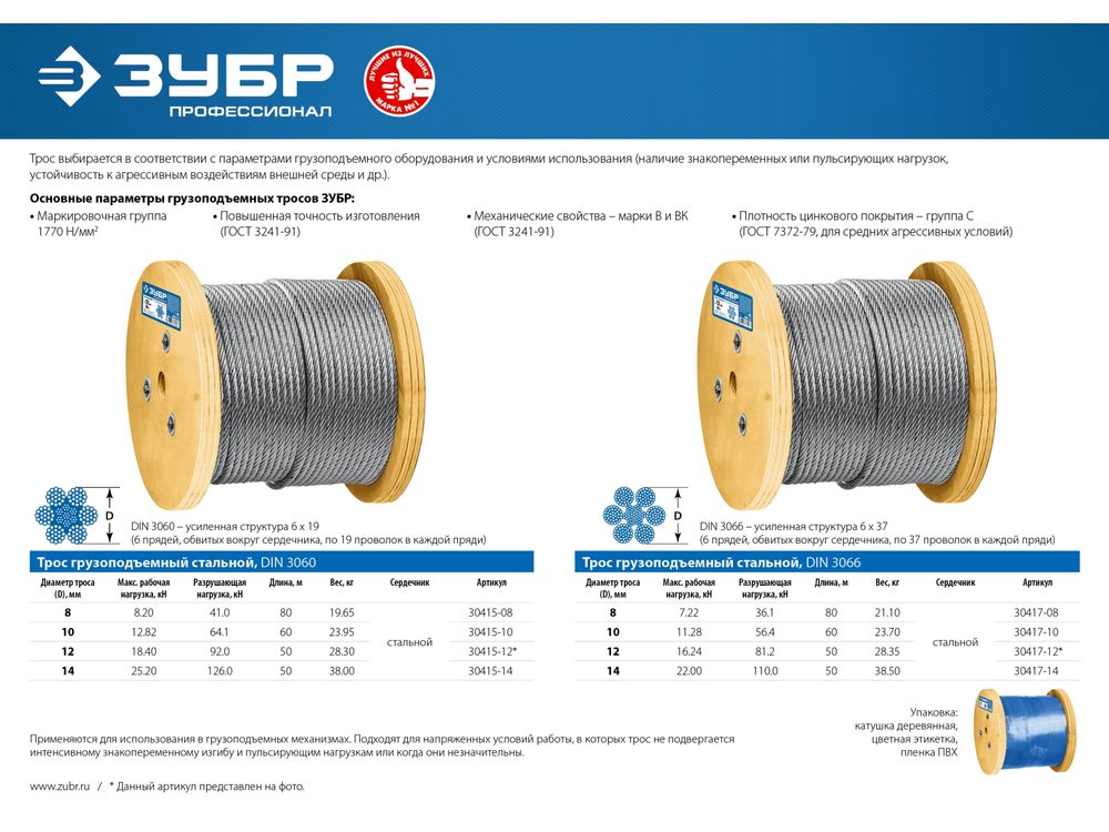 Трос грузоподъемный стальной, оцинкованный, DIN 3060, d-12 мм, L-50 м, ЗУБР Профессионал-738
