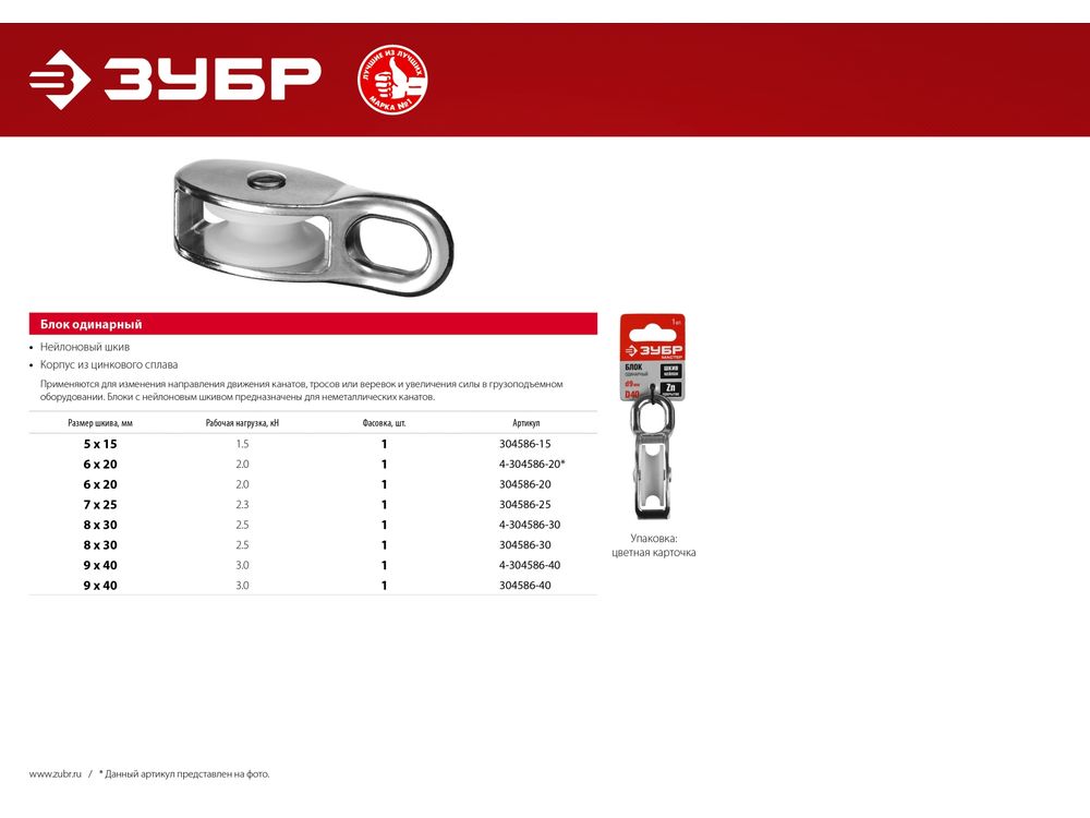 Блок одинарный, 5x15мм, 1 шт, нейлоновый шкив, ЗУБР