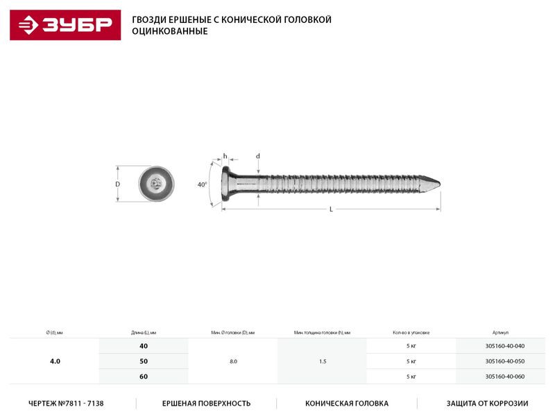 Гвозди ЗУБР МАСТЕР ершеные с конической головкой, оцинкованные, чертеж №7811-7138, 4.0х40мм, 5кг