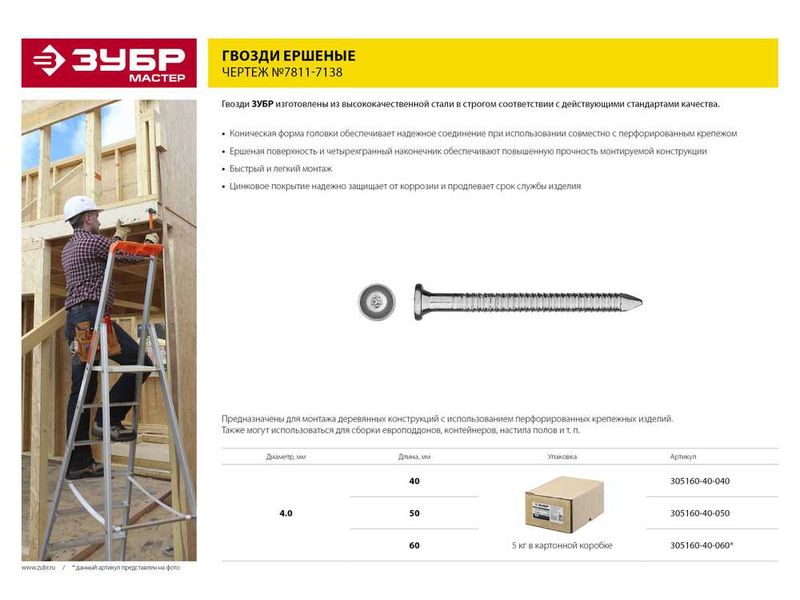 Купить Гвозди ЗУБР МАСТЕР ершеные с конической головкой, оцинкованные, чертеж №7811-7138, 4.0х40мм, 5кг