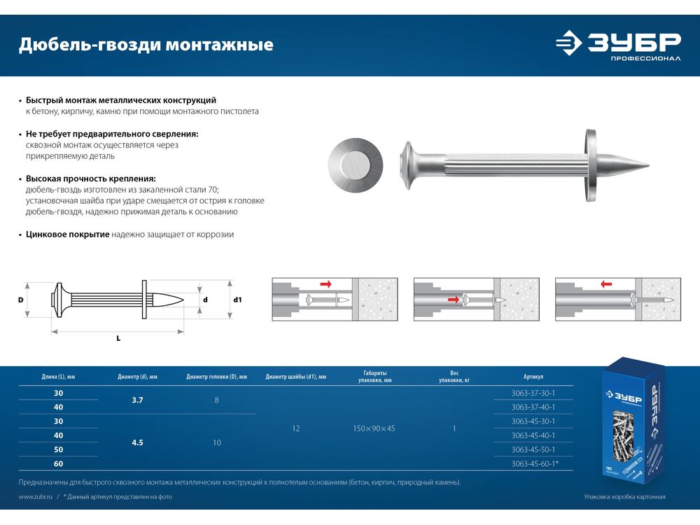 ЗУБР ДГМ 40 х 3.7 мм, дюбель-гвоздь монтажный, цинк, 1 кг (3063-37-40-1)
