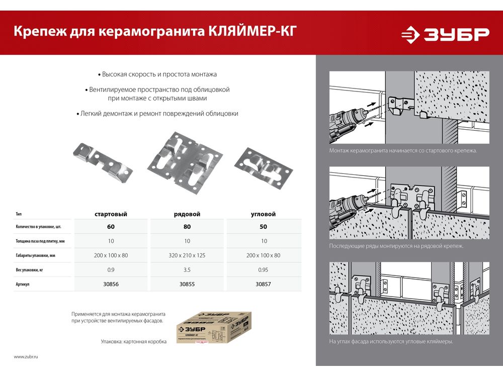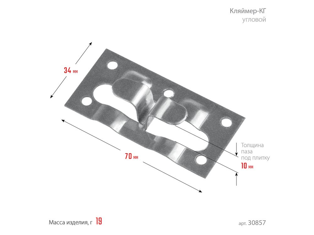 ЗУБР Кляймер-КГ 10 х 34 х 70 мм, угловой крепеж для керамогранита, цинк, 50 шт (30857)