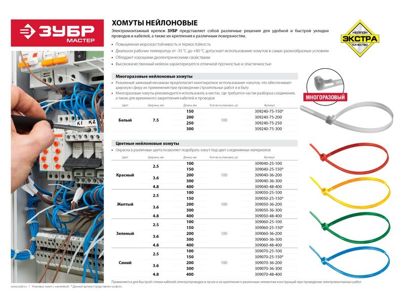 Для быстрой стяжки кабелей электропроводки в пучок и их крепления к различным элементам конструкции при проведении электромонтажных работ.