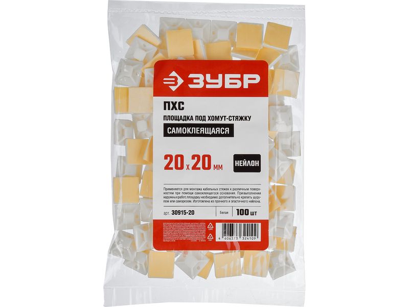 Площадка под хомут-стяжку ПХС самоклеющаяся белая, 20 x 20 мм, 100 шт, нейлоновая, ЗУБР
