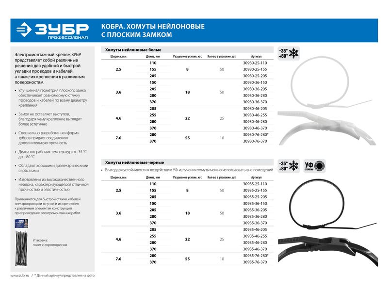 Диапазон рабочих температур от -35°С до +80°С допускает использование стяжек в самых разнообразных условиях. Монтаж должен производится при температуре от -0°С до +60°С