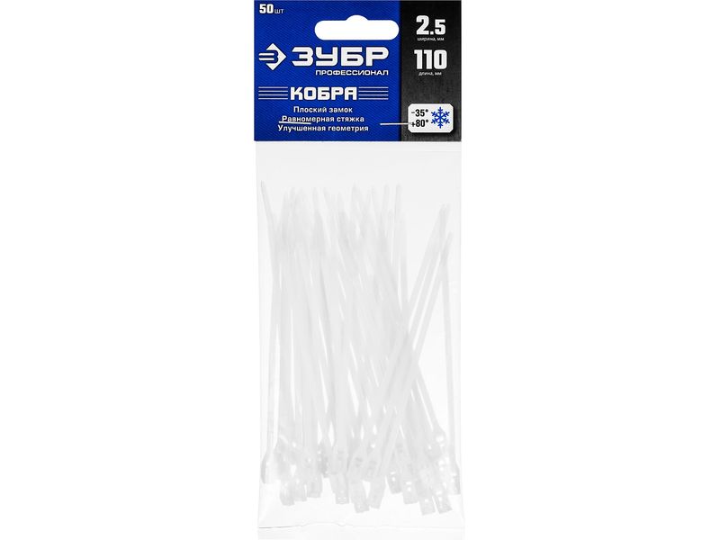 Кабельные стяжки белые КОБРА, с плоским замком, 2.5 х 110 мм, 50 шт, нейлоновые, ЗУБР