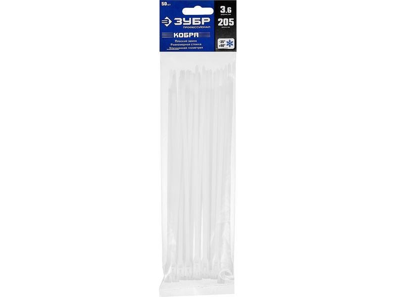 Кабельные стяжки белые КОБРА, с плоским замком, 3.6 х 205 мм, 50 шт, нейлоновые, ЗУБР