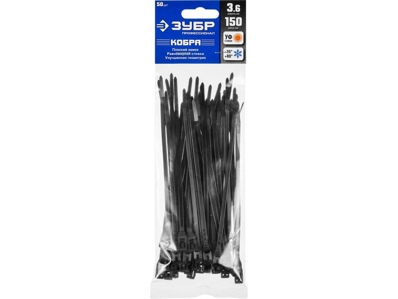 Купить Кабельные стяжки черные КОБРА, с плоским замком, 3.6 х 150 мм, 50 шт, нейлоновые, ЗУБР