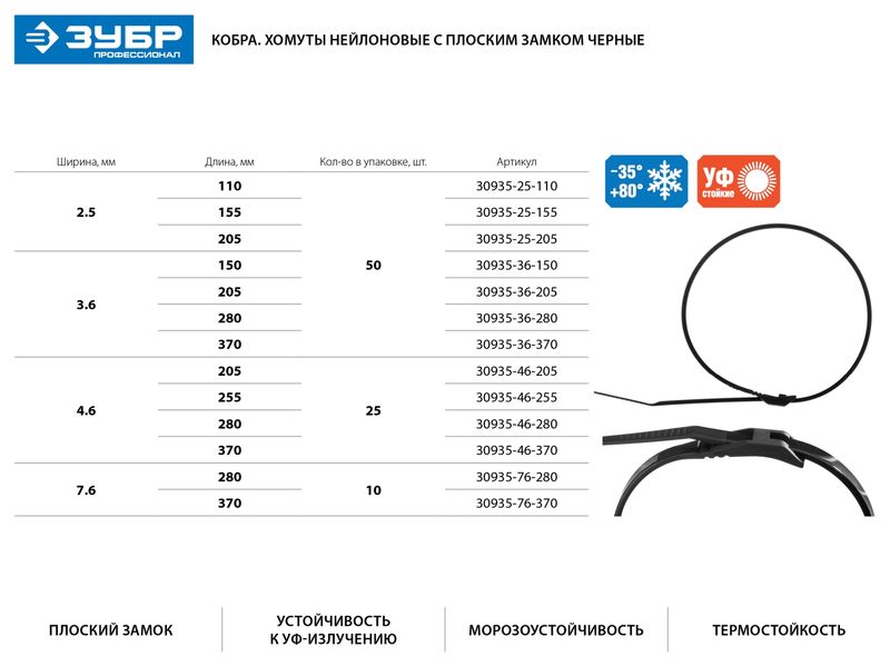 Диапазон рабочих температур от -35°С до +80°С допускает использование стяжек в самых разнообразных условиях. Монтаж должен производится при температуре от -0°С до +60°С