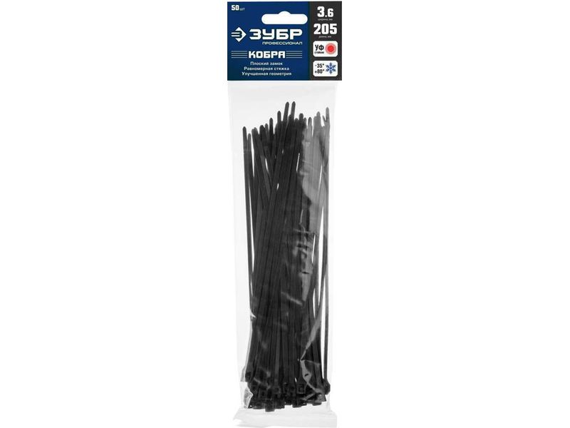 Кабельные стяжки черные КОБРА, с плоским замком, 3.6 х 205 мм, 50 шт, нейлоновые, ЗУБР