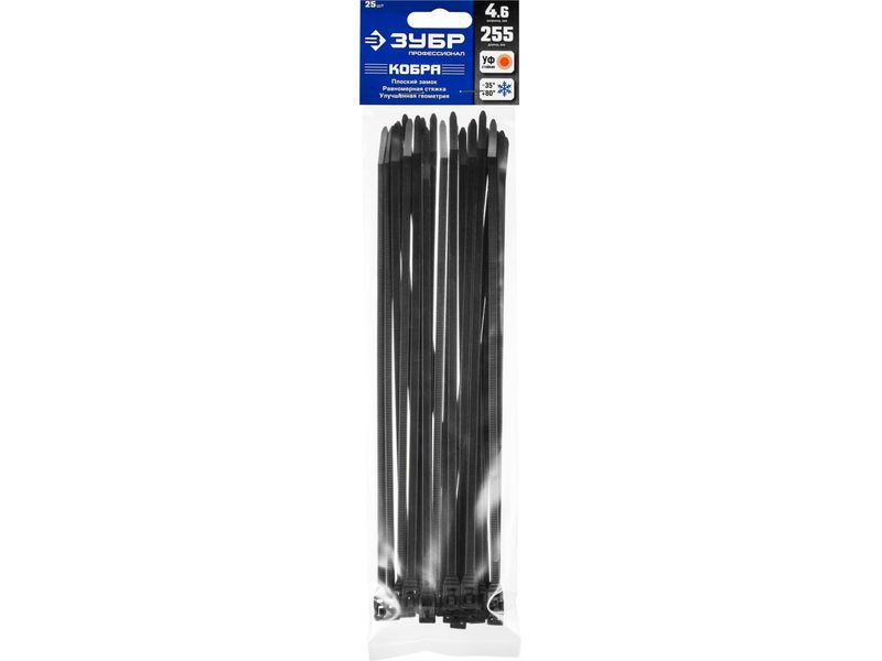 Кабельные стяжки черные КОБРА, с плоским замком, 4.6 х 255 мм, 25 шт, нейлоновые, ЗУБР