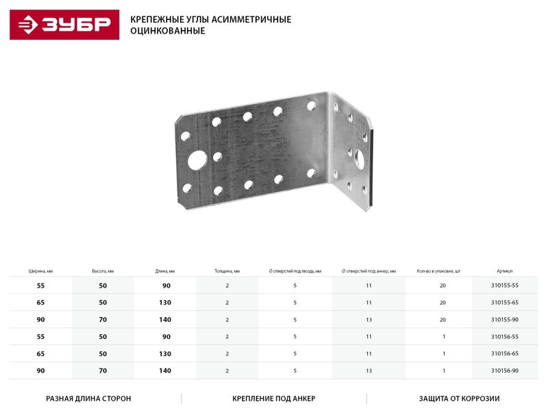 Крепежный уголок ЗУБР МАСТЕР асимметричный, 65х50х130мм, 1шт
