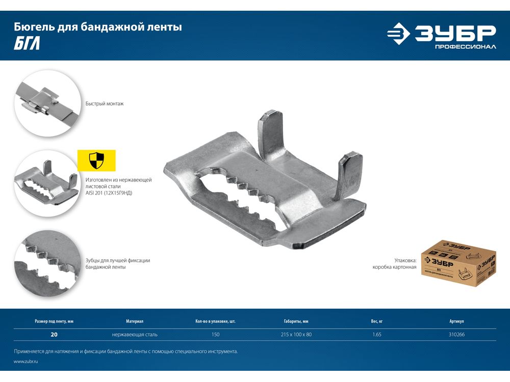 Бюгель - специальный крепеж для фиксации бандажной ленты. Создает хомутное соединение совместно с лентой, выполняя функцию замка. Бандажная лента используется для крепления указателей, знаков, вывесок и т.д.. Правильно подобранная лента обеспечит простоту монтажа и надежность крепления.