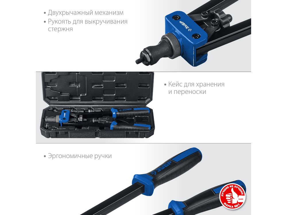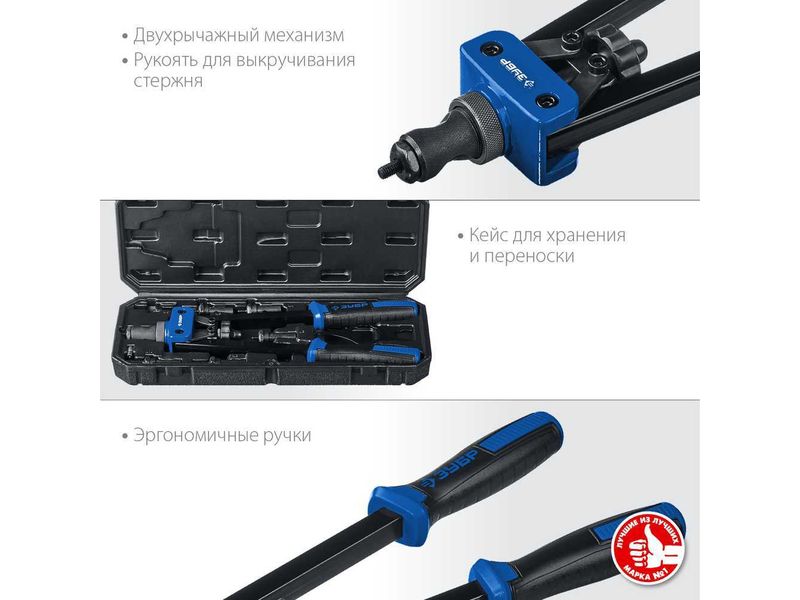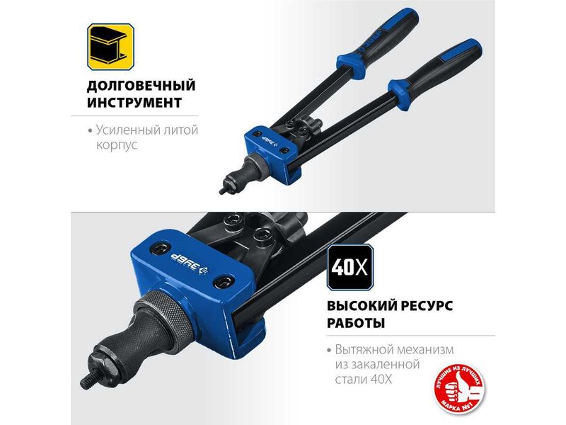 Надежный инструмент для работы со стальными и алюминиевыми резьбовыми заклепками. Двухрычажная конструкция корпуса значительно облегчает работу.