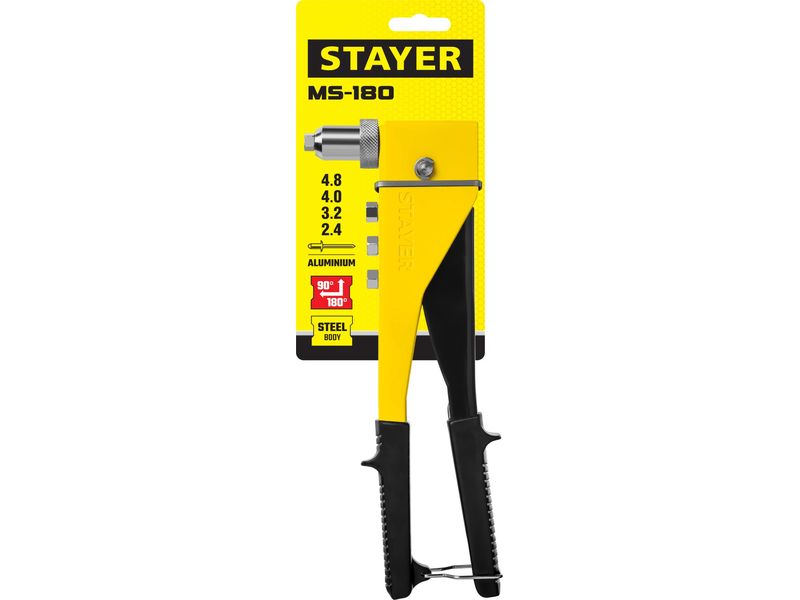 Заклепочник переставной 90-180°, STAYER MaxFix "MS 180" 3107, для заклёпок d-2,4-4,8 мм из алюминия, стальной корпус |
