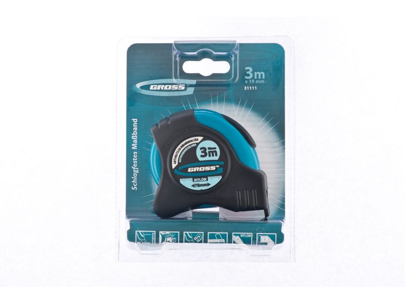 Рулетка Gross «Schlagfest» 31111 с магнитным обрезиненным зацепом, двухсторонней шкалой и функцией автоматической фиксации полотна длиной 3 м и шириной 19 мм, с нейлоновым покрытием, позволяет определять размеры предметов, вычислять площадь помещения и проводить другие измерительные работы. Магнитный обрезиненный зацеп надежно фиксируется на скользких и металлических поверхностях со сложной формой. Карманная рулетка пригодится на строительной площадке и в быту.
