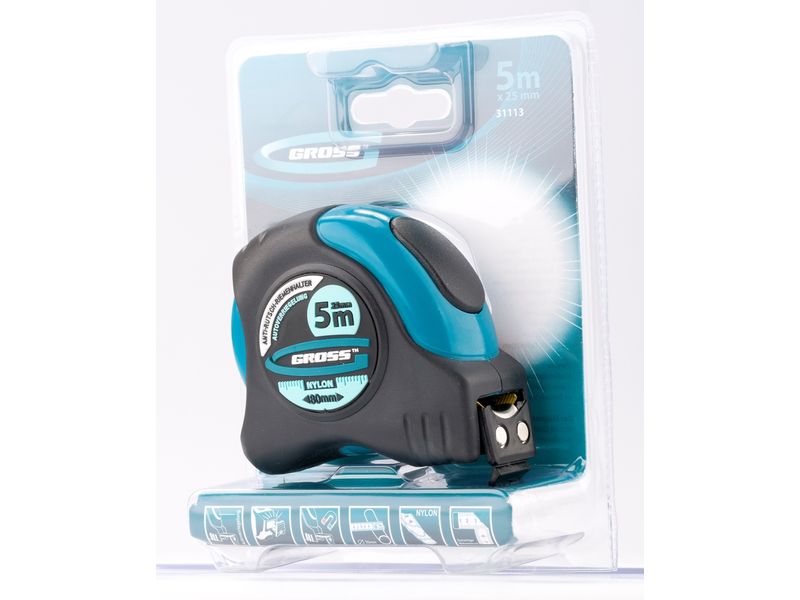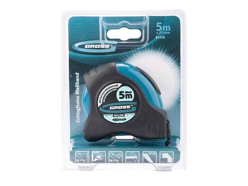Рулетка Gross «Schlagfest» 31113 с магнитным обрезиненным зацепом, двухсторонней шкалой и функцией автоматической фиксации полотна длиной 5 м и шириной 25 мм, с нейлоновым покрытием, позволяет определять размеры предметов, вычислять площадь помещения и проводить другие измерительные работы. Магнитный обрезиненный зацеп надежно фиксируется на скользких и металлических поверхностях со сложной формой. Широкое упругое полотно облегчает работу в труднодоступных местах. Карманная рулетка пригодится на строительной площадке и в быту.