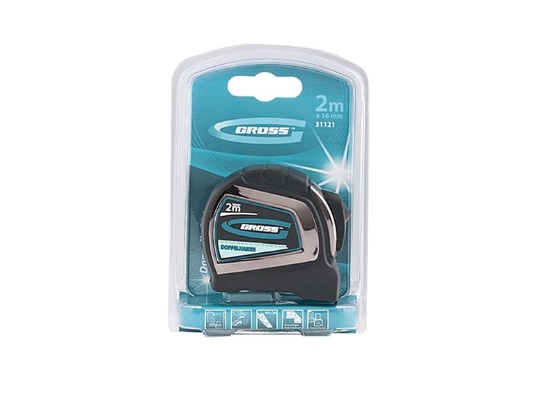 Автоматическая рулетка Gross «Doppelhaken» 31121 с односторонним зацепом, лентой размером 2 м x 16 мм, с двухсторонней шкалой и нейлоновым покрытием, предназначена для проведения измерений стен, полов, различных материалов и конструкций. Пригодится на строительной площадке и в быту.