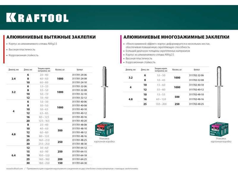 Купить Многозажимные алюминиевые заклепки Multi (Al5052), 4.8 х 16 мм, 500 шт, KRAFTOOL