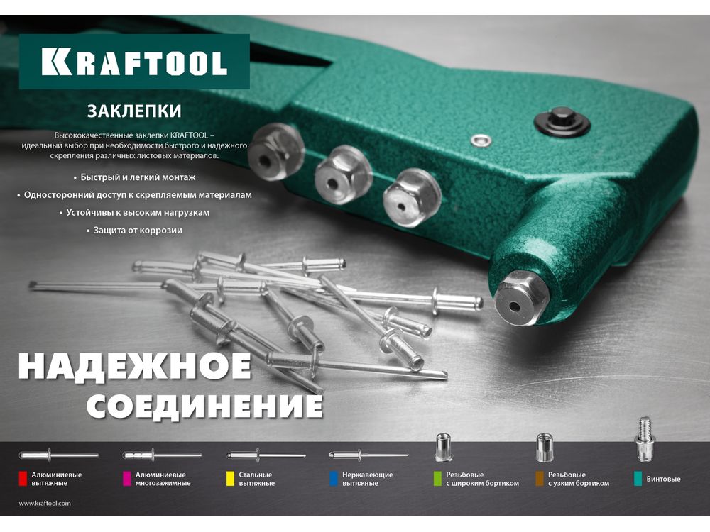 Для получения неразъемного заклепочного и, одновременно, разъемного резьбового соединения из двух и более слоев материала. Установка заклепок производится в предварительно просверленное отверстие при помощи резьбового заклепочника.
