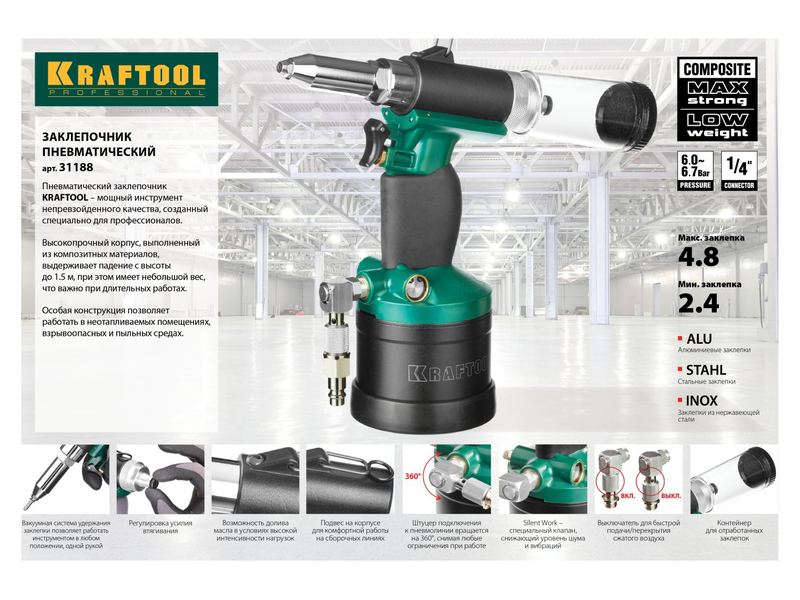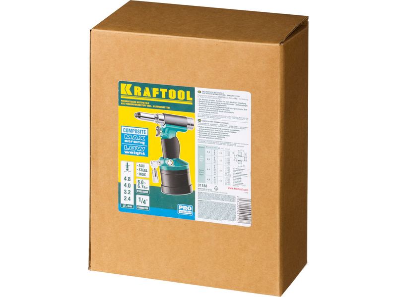 Заклепочник KRAFTOOL PRO пневматический, корпус из композит материалов, для заклепок из нержав стали, 2,4-3,2-4-4,8мм