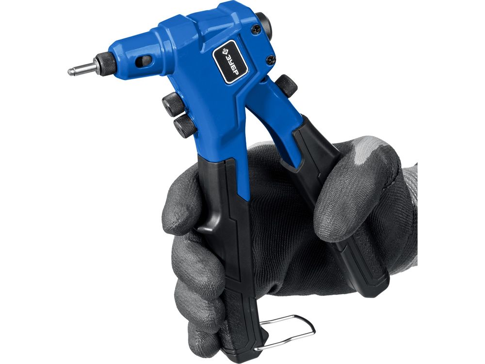 Применяется для установки вытяжных заклепок. Используется с нержавеющими заклепками 2.4, 3.2 мм, стальными заклепками 2.4, 3.2, 4.0 мм, алюминиевыми заклепками 2.4, 3.2, 4.0, 4.8 мм Способ применения: 1. Просверлите отверстие 2. Установите заклепку в заклепочник, а затем в отверстие 3. Сжимайте и разжимайте рукоятки заклепочника до момента откусывания хвостовика заклепки 4. Заклепка установлена