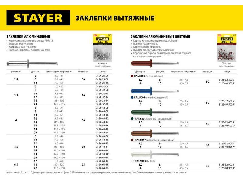 Алюминиевые заклепки Color-FIX, 4.0 х 10 мм, RAL 3005 темно-красный, 50 шт., STAYER Professional-859
