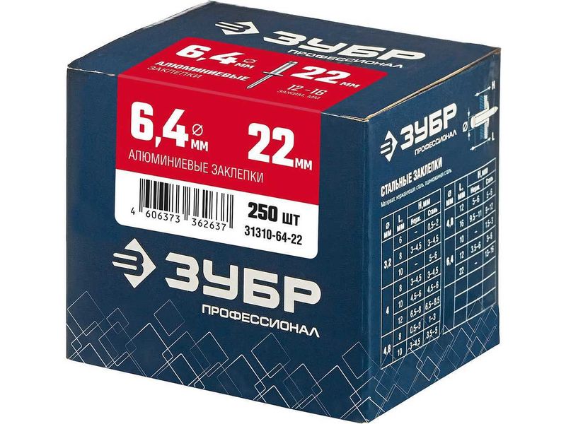Алюминиевые заклепки, 6.4 х 22 мм, 250 шт., ЗУБР Профессионал-859
