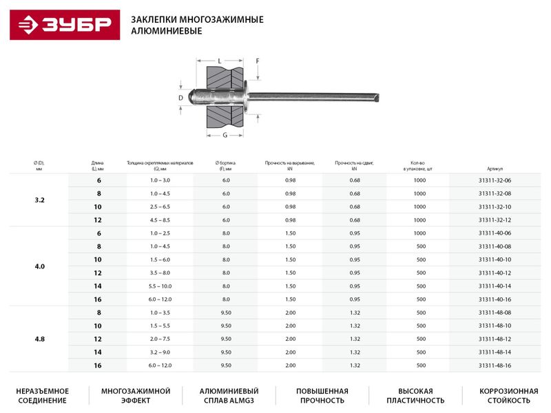Заклепки многозажимные, алюминиевые, 4,8x10 мм, 500 шт, ЗУБР Профессионал