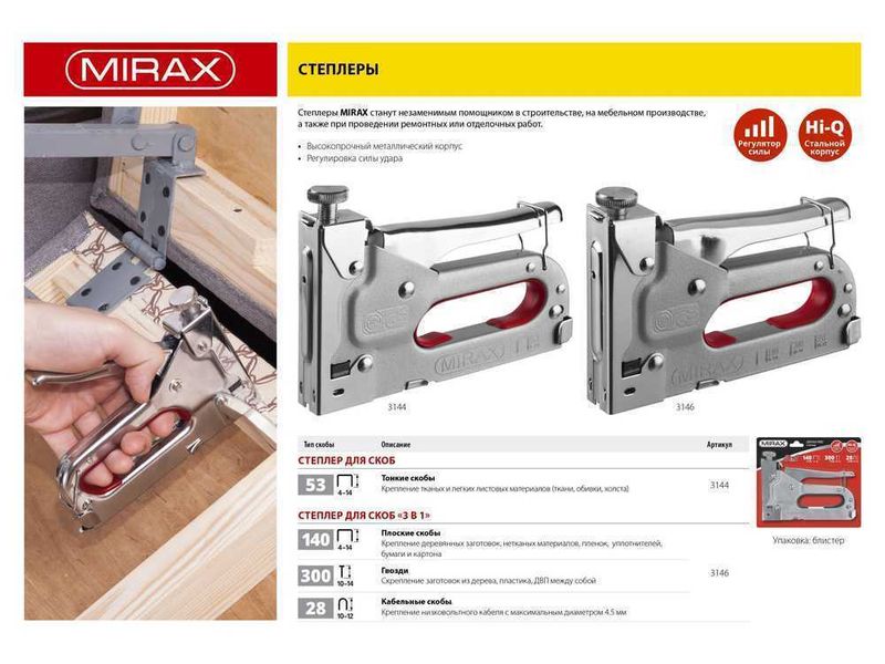 Купить Степлер с регулировкой силы удара, металлический корпус, для тонкой скобы тип 53 (4-14 мм), MIRAX
