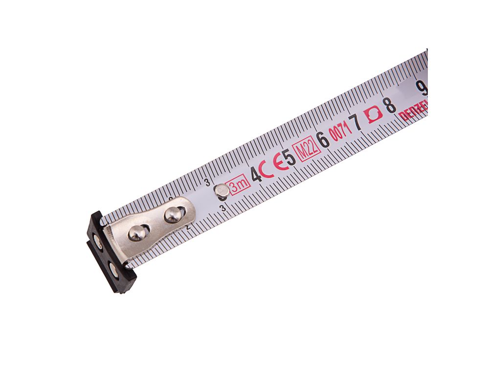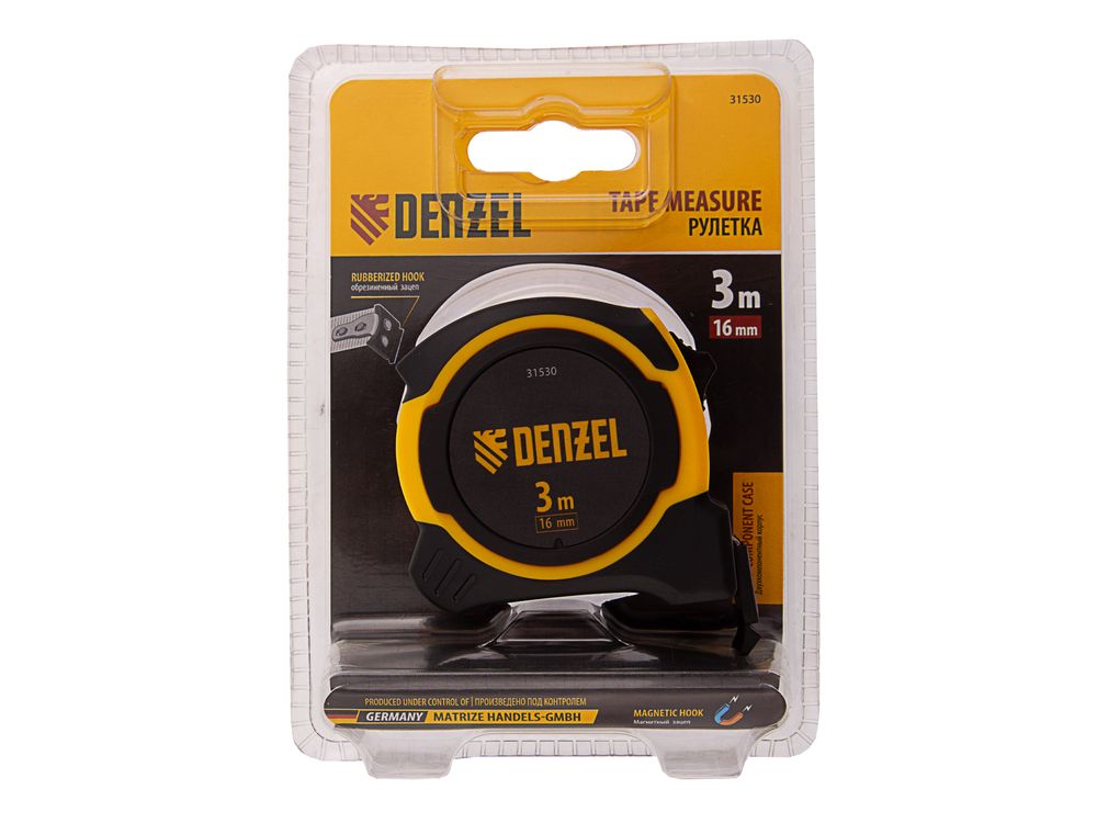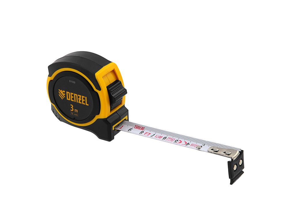 Рулетка Denzel 31530 в двухкомпонентном корпусе, с измерительной лентой шириной 16 мм и магнитным обрезиненным зацепом, позволяет определять размеры предметов и расстояния до 3 м. Рулетка будет полезна при проведении строительных, ремонтных и различных бытовых работ.