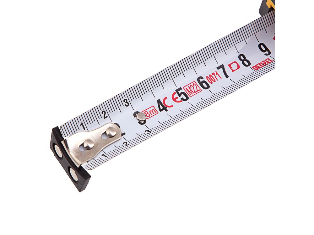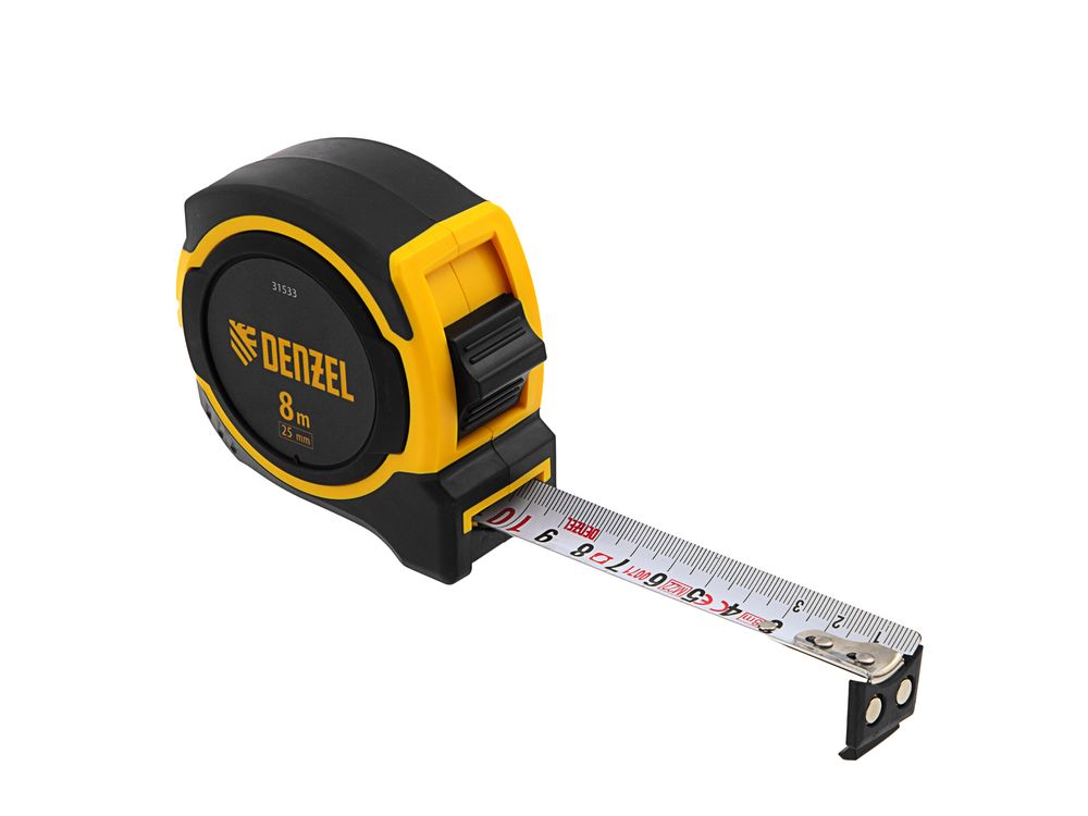 Рулетка Denzel 31533 в двухкомпонентном корпусе, с измерительной лентой шириной 25 мм и магнитным обрезиненным зацепом, позволяет определять размеры предметов и расстояния до 8 м. Широкая упругая лента упрощает проведение измерений в труднодоступных местах. Рулетка будет полезна при проведении строительных, ремонтных и различных бытовых работ.