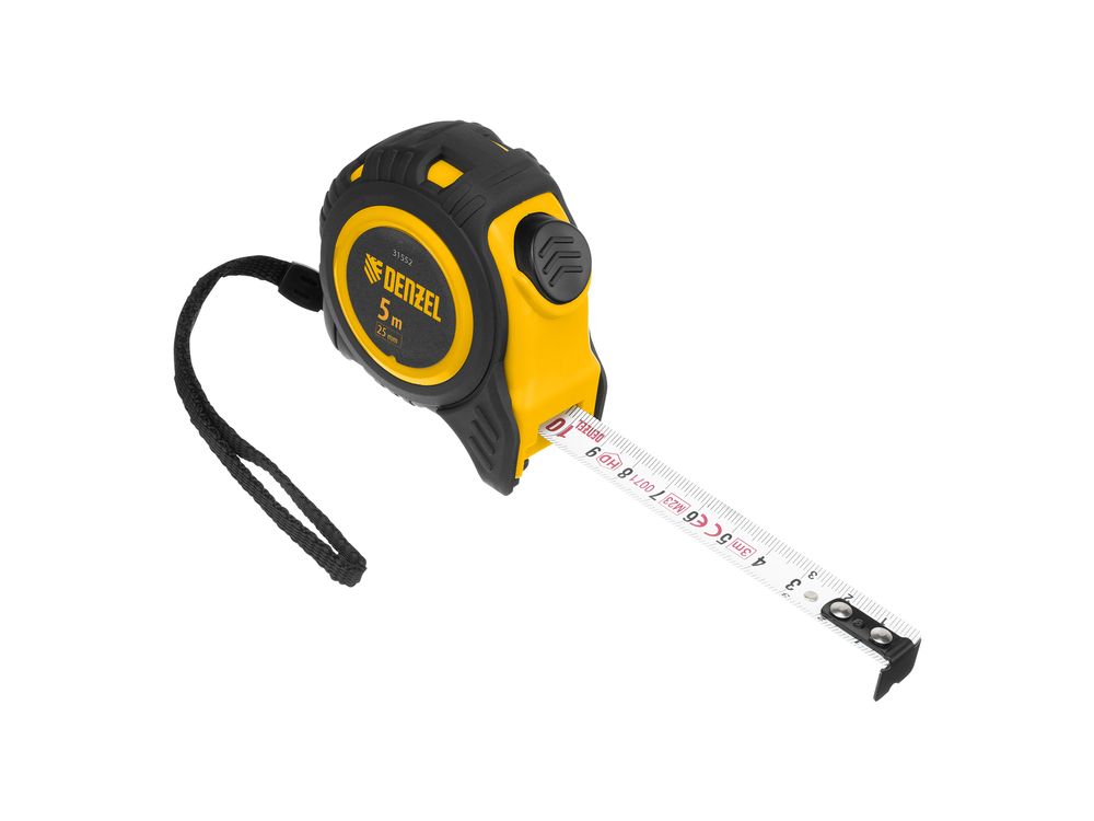 Рулетка Denzel 31552 в обрезиненном корпусе, с автоматической фиксацией, с полотном шириной 25 мм и длиной 5 м, используется для измерения расстояний и размеров предметов. Стальная лента с эмалевым покрытием и защитной пластиной в месте крепления зацепа рассчитана на долгий срок службы. Рулетка будет полезна во время строительства и ремонта, а также пригодится в быту.
