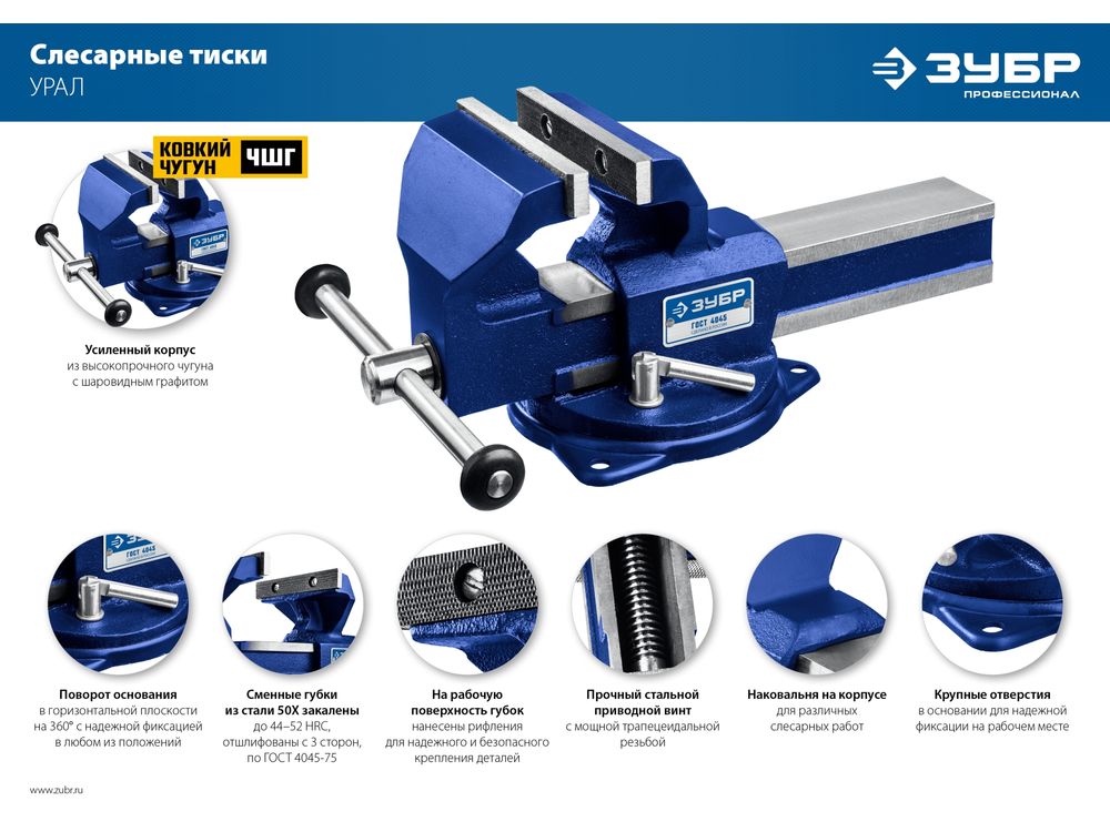 Тиски слесарные ЗУБР изготовлены из высокопрочного чугуна с шаровидным графитом, соответствуют самым высоким техническим требованиям. Поворотное основание на 360. Обеспечивают длительную и качественную работу.