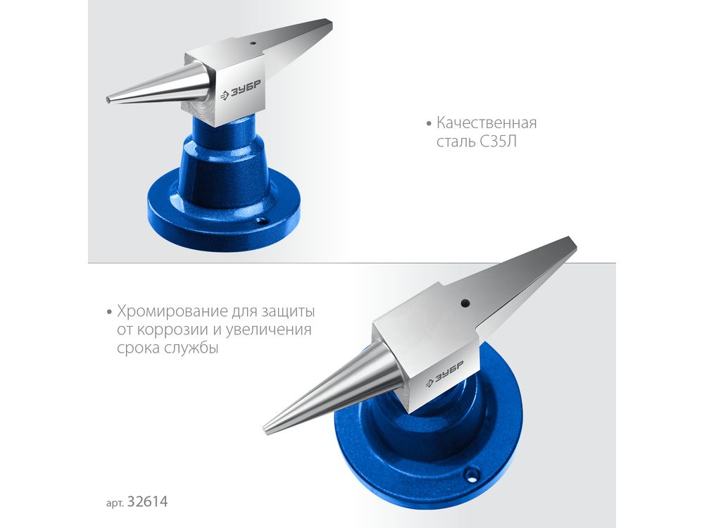 Стальная двурогая наковальня ЗУБР (шперак) для ювелирных работ и работы с проволокой . Антикоррозионное покрытие хромированием Сталь С35Л. Поверхность закалена на глубину 0,8-1,5 мм. Твердость рабочей части HB 340-477. Отверстия 3-4 мм для установки инструмента. Увеличенный срок службы. Для точных работ. Серия Профессионал У настольной версии предусмотрены отверстия для жеской фиксации на столе.