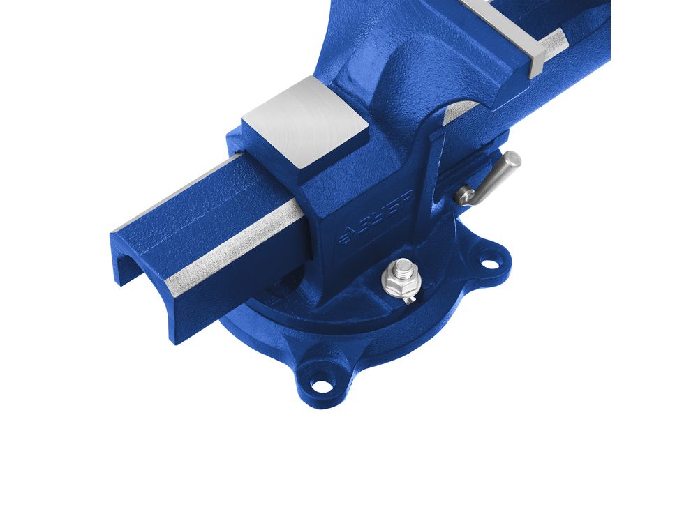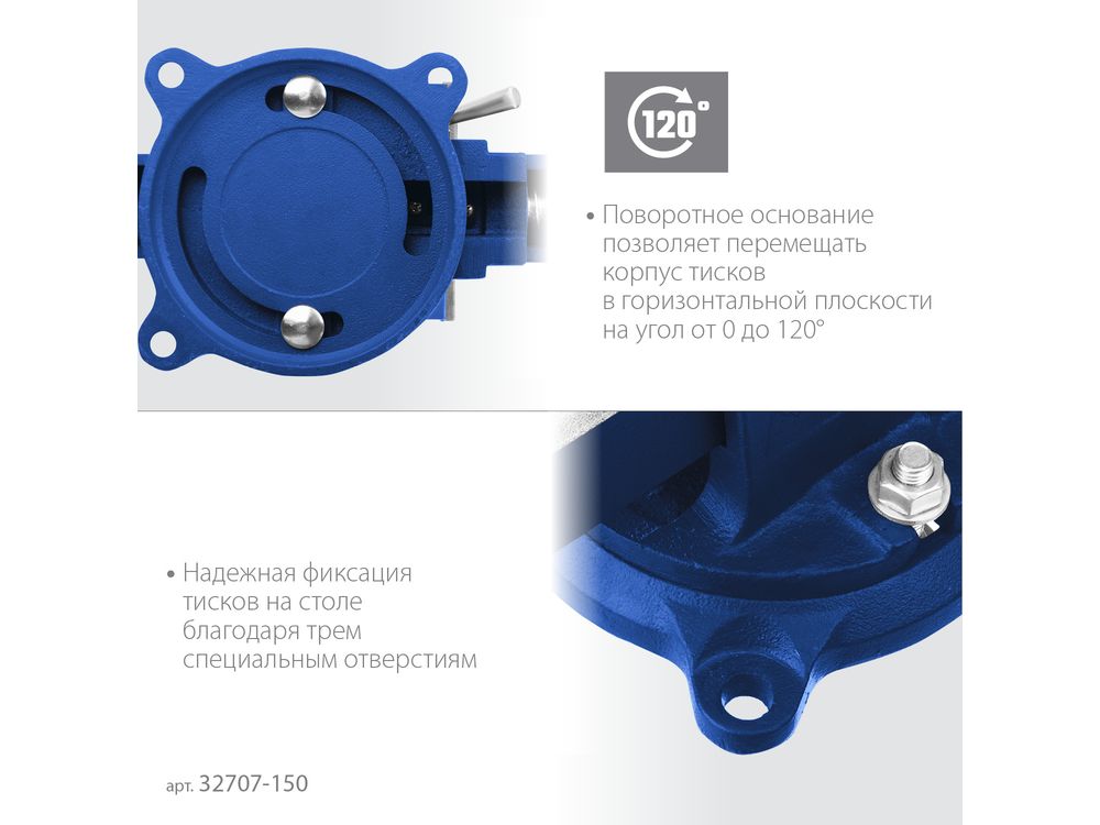 Преимущества Износостойкий ковкий чугун с шаровидным графитом Механизм быстрой фиксации для ускорения рабочего процесса, экономии сил и рабочего времени. Сменные губки изготовлены из высококачественной инструментальной стали и закалены до твердости 45-53HRC и отшлифованы Поворотное основание позволяет перемещать корпус тисков в горизонтальной плоскости на угол от 0 до 360 градусов Усилие зажима 3500 кг/см3 На рабочую поверхность губок нанесены рифления для надежного и безопасного крепления деталей Увеличенная наковальня на корпусе тисков для выполнения слесарных работ Фиксация тисков на столе при помощи винтов и гаек в специальные отверстия в основании Прочные стальные рукоятки для надежной фиксации инструмента Использование Для зажима различных предметов или их отдельных составных элементов