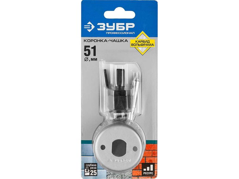 Купить Коронка-чашка ЗУБР ПРОФЕССИОНАЛ c карбид-вольфрамовым нанесением, 51 мм, высота 25 мм, в сборе с державкой и сверлом