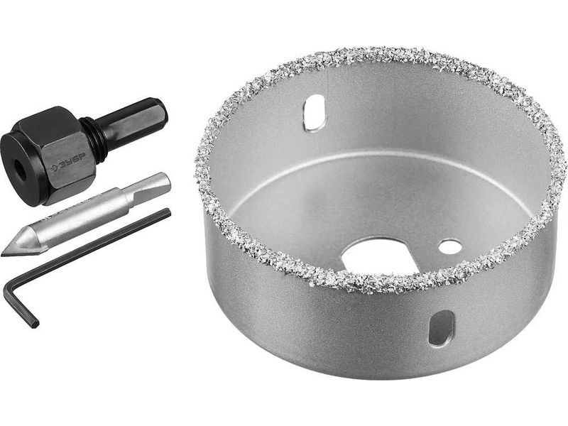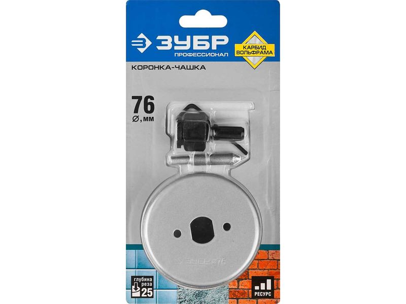 Купить Коронка-чашка ЗУБР ПРОФЕССИОНАЛ c карбид-вольфрамовым нанесением, 76 мм, высота 25 мм, в сборе с державкой и сверлом