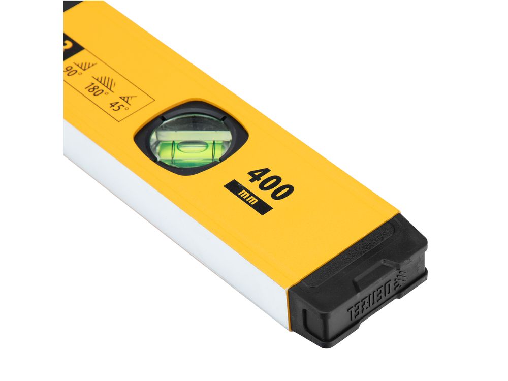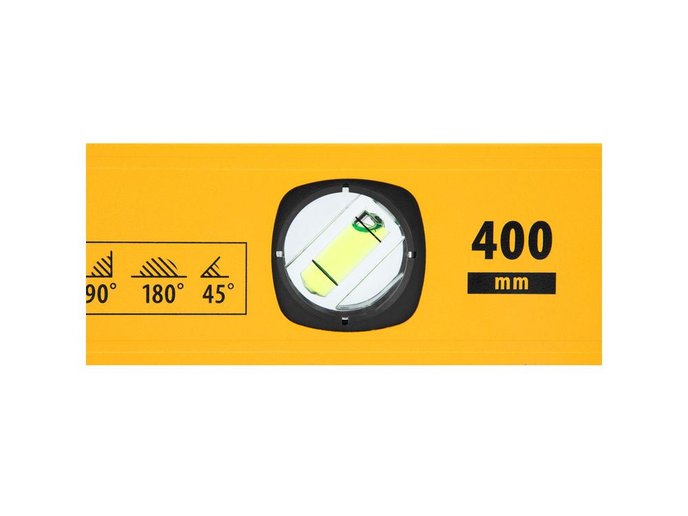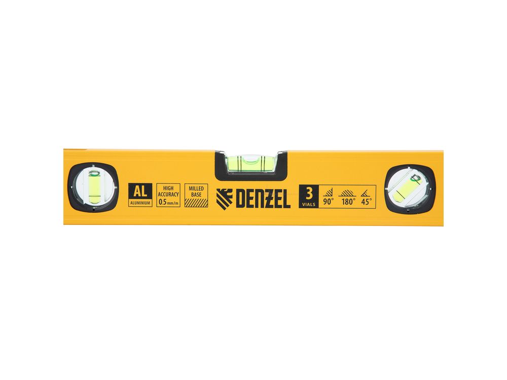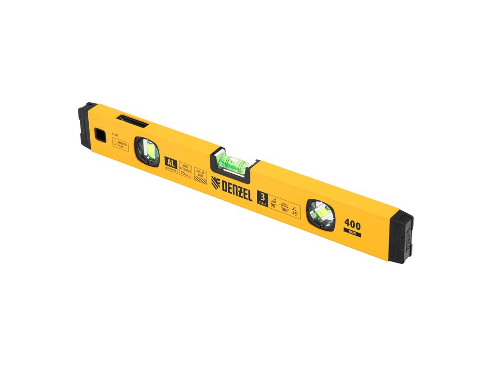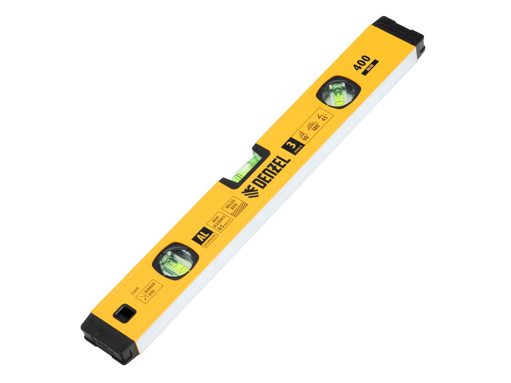 Алюминиевый фрезерованный уровень Denzel 33690 длиной 400 мм, с магнитом и 3 глазками, из которых 1 зеркальный, предназначен для контроля отклонений от горизонтальной, вертикальной и поверхности под углом 45° с точностью 0,5 мм/м. 3 пузырьковые камеры 90°, 180° и 45° позволяют быстро проверить правильность разметки. Инструмент незаменим при проведении строительных, ремонтных, сантехнических работ.