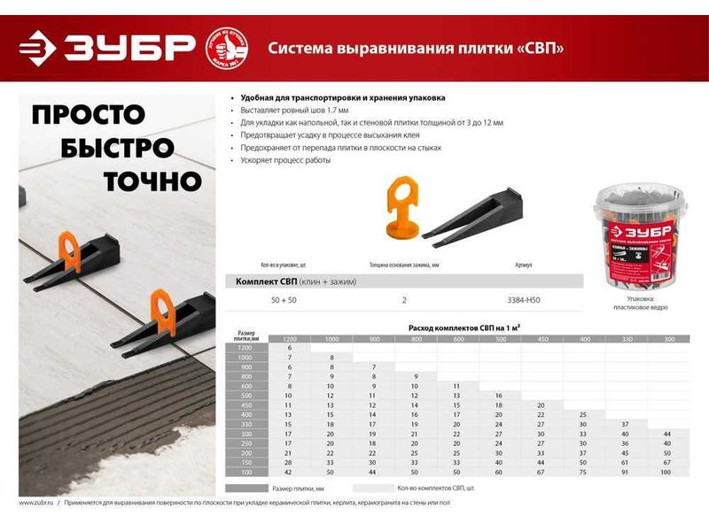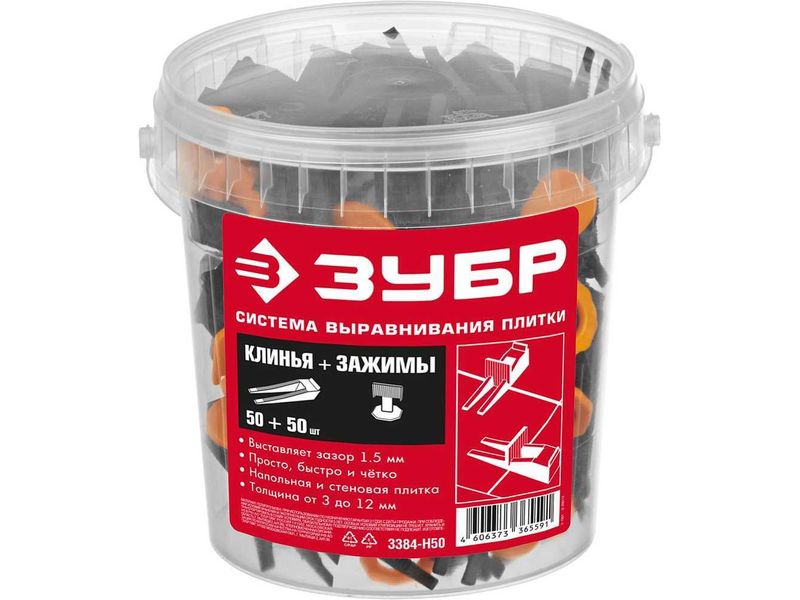 ЗУБР СВП комплект: 50+50шт (1,7 мм зажим + клин), система выравнивания плитки, в ведре.